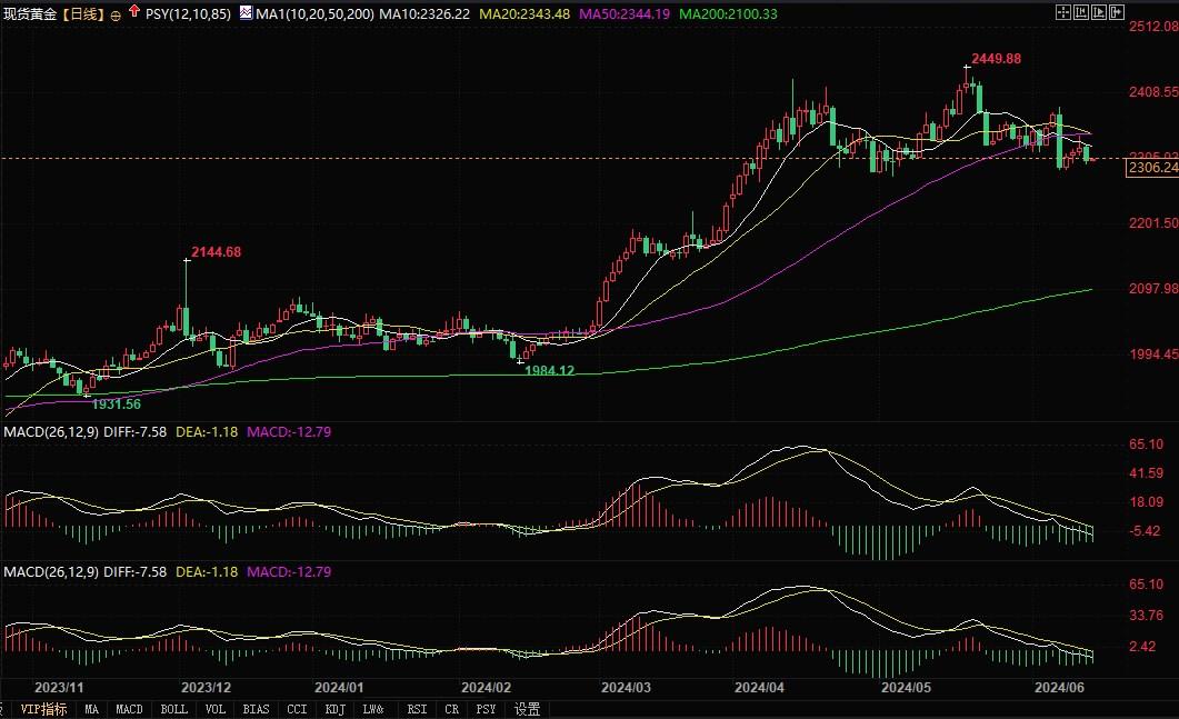 现货黄金日线图北京时间6月14日10:54,现货黄金报2305.77美元/盎司